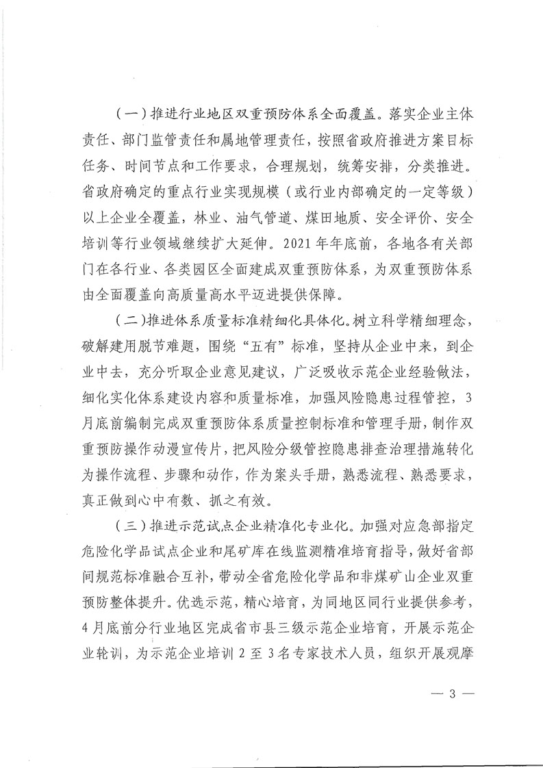 为保障双重预防体系由全面覆盖向高质量高水平迈进,通知提出,在分类推进的同时,省政府确定的重点行业实现规模(或行业内部确定的一定等级)以上企业全覆盖,林业、油气管道、煤田地质、安全评价、安全培训等行业领域继续扩大延伸。今年年底前,各地各有关部门在各行业、各类园区全面建成双重预防体系。3月底前编制完成双重预防体系质量控制标准和管理手册,制作双重预防操作动漫宣传片,把风险分级管控隐患排查治理措施转化为操作流程、步骤和动作,推进体系质量标准精细化具体化。