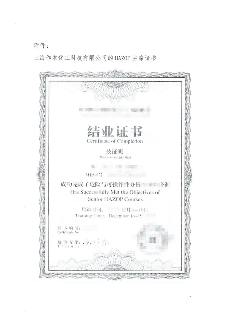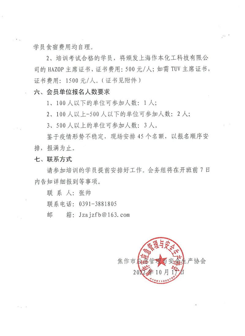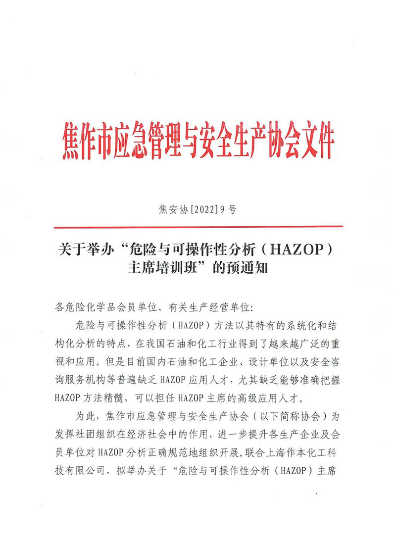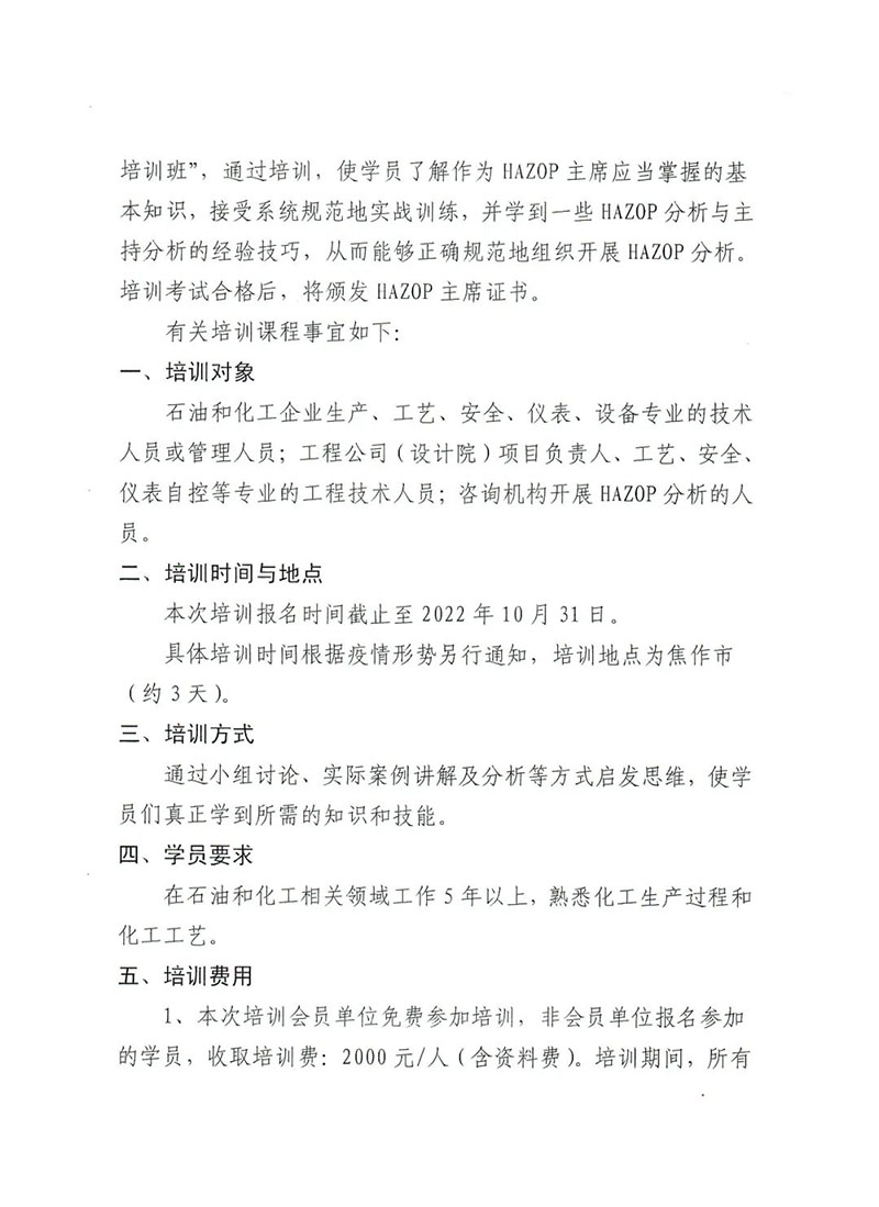 关于举办“危险与可操作性分析(HAZOP)主席培训班”的预通知