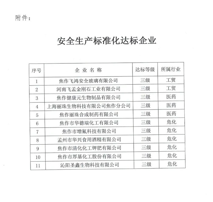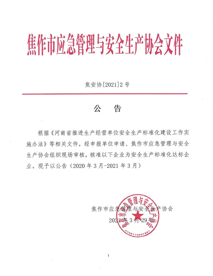 安全生产标准化达标企业公告焦安协2号 安全生产标准化达标企业公告